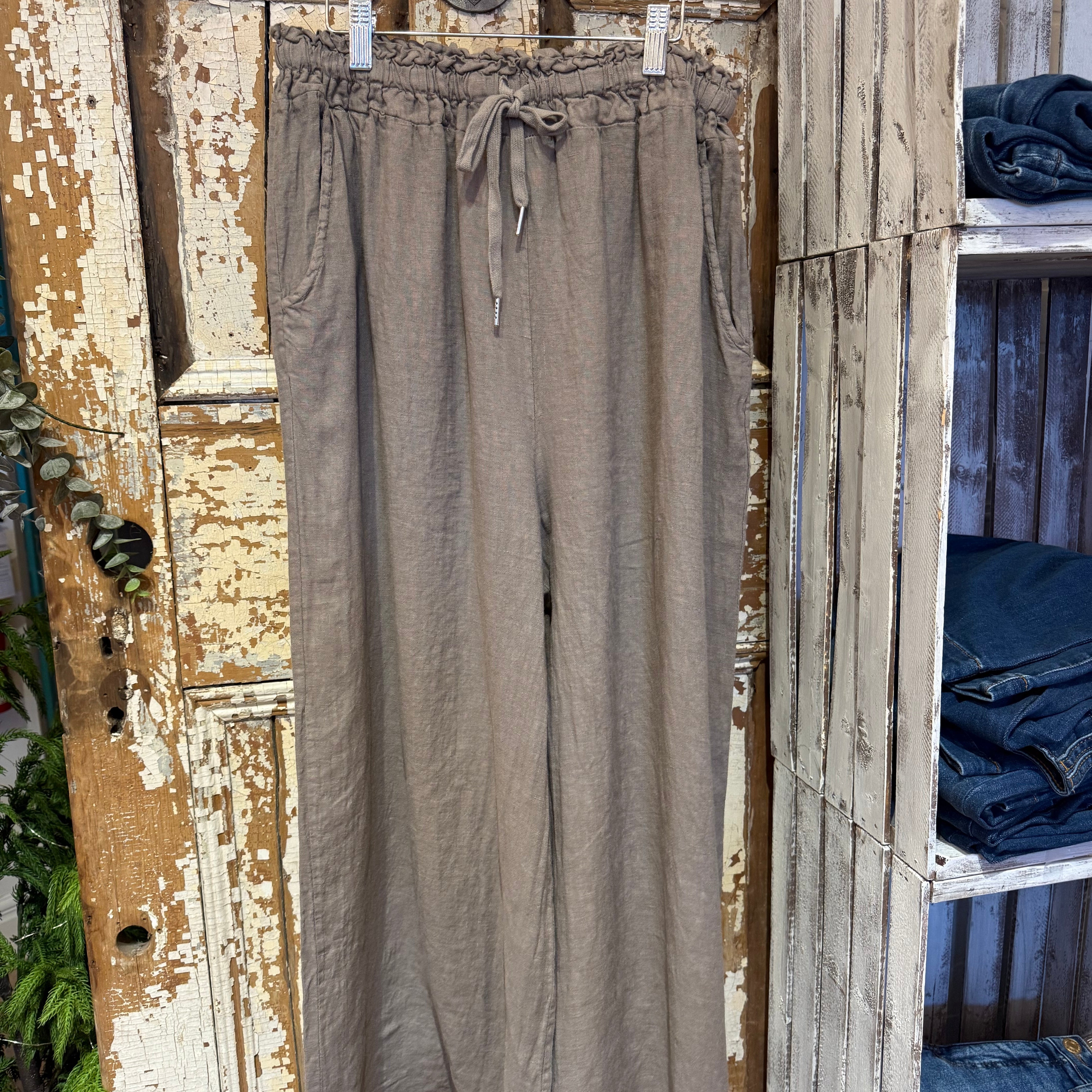 Crafted from premium Italian linen, these wide-leg pants offer effortless comfort with a adjustable drawstring waist and practical pockets. The breathable fabric drapes beautifully while maintaining its natural texture, making them perfect for relaxed days or layered styling. A versatile wardrobe essential that feels as good as it looks.