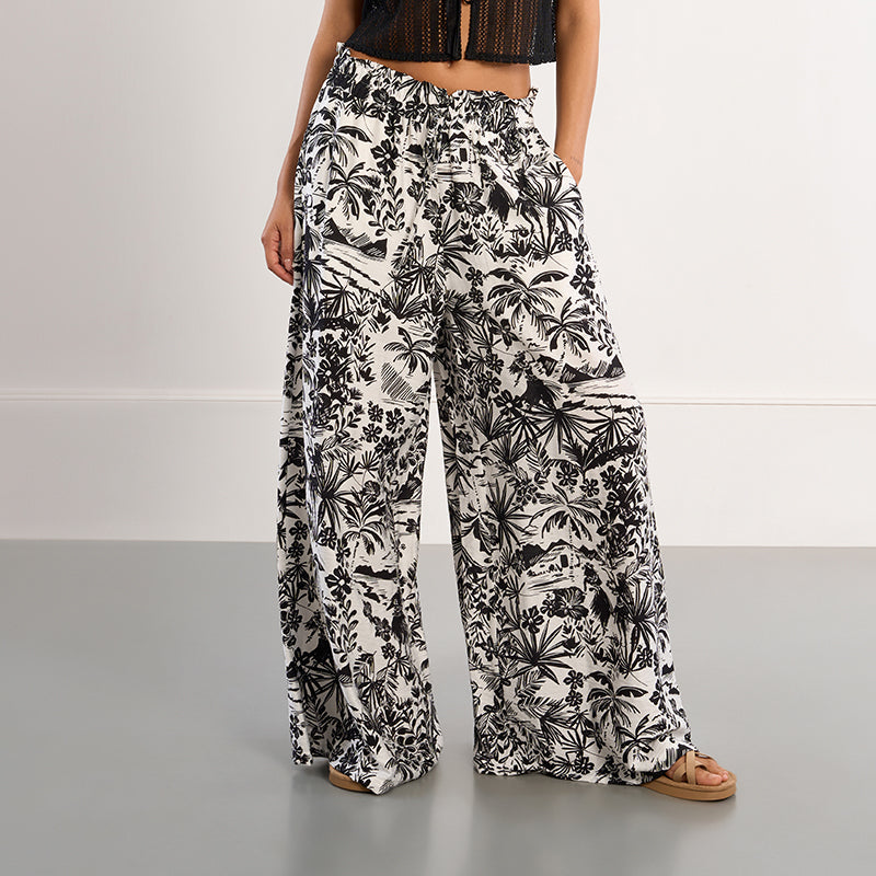 Effortless tropical-inspired baggy pants crafted from woven fabric. Features a comfortable elastic waistband and functional pockets—perfect for relaxed, everyday wear. The vibrant print brings a playful, vacation-ready vibe to your wardrobe.