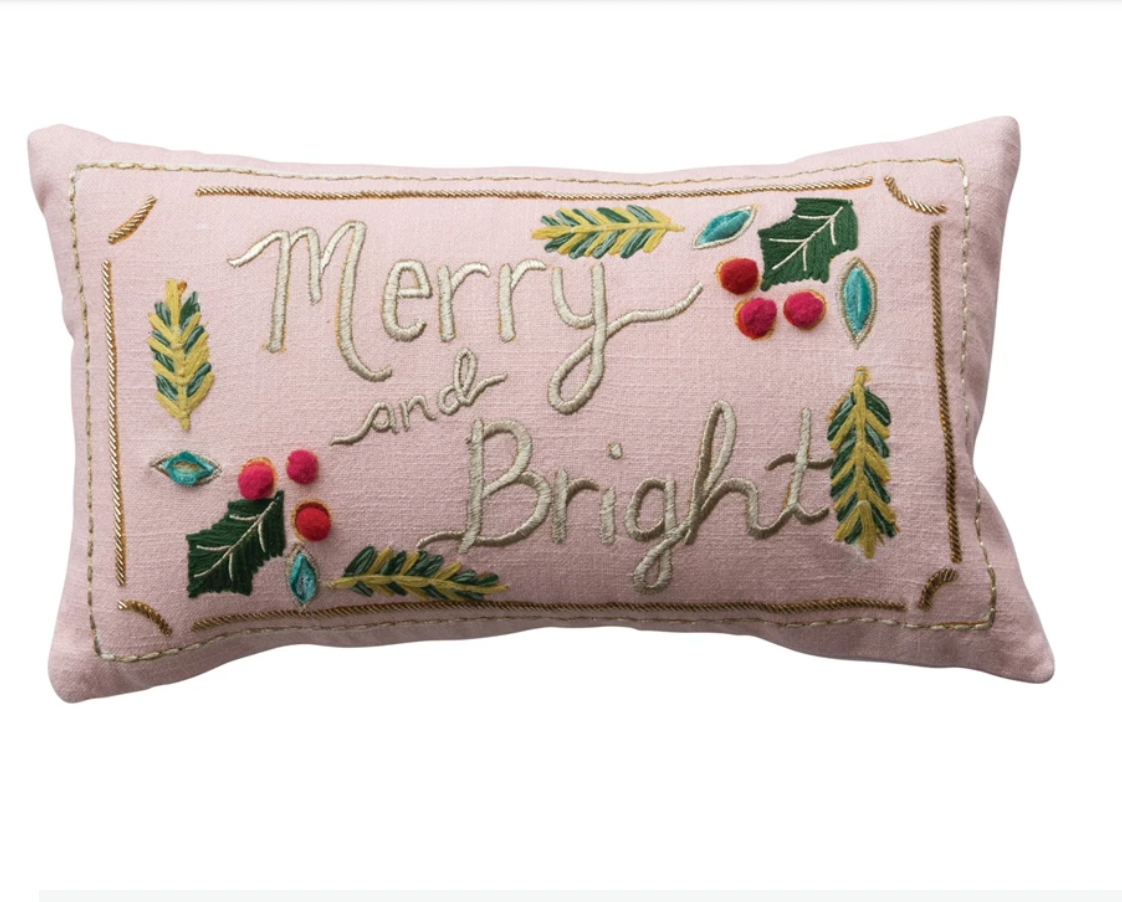 18"L x 10"H Slub Lumbar Pillow w/ Hand-Embroidery, Pom Poms, Beads, Metallic Thread & Velvet Back "Merry and Bright"