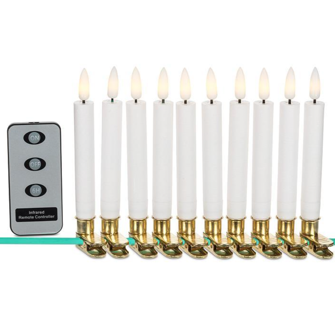 Elevate your tree with our Set of 10 LED Clip-On Candles & Remote, a safe and festive way to add a warm glow to your holiday decor. These candles feature secure clips for easy attachment to branches. The LED lights emit a cozy ambiance, and the clip design ensures a secure and adjustable placement on your tree. Illuminate your holiday season with these artfully crafted and convenient clip-on LED candles.