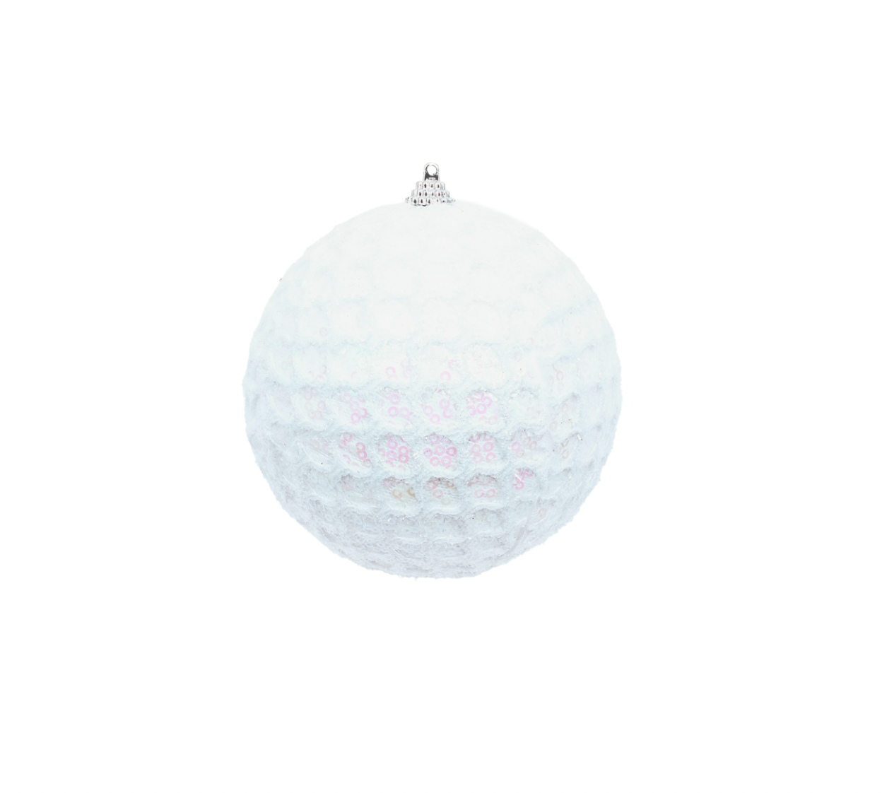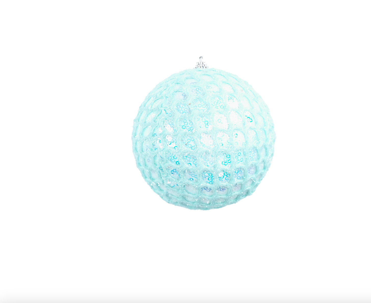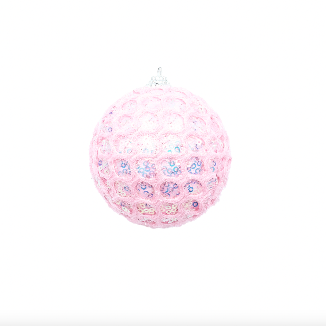 These mesh ornaments with sequins make a statement on your tree. Available in mint, pink, white and 2 sizes. 3" or 4.5"