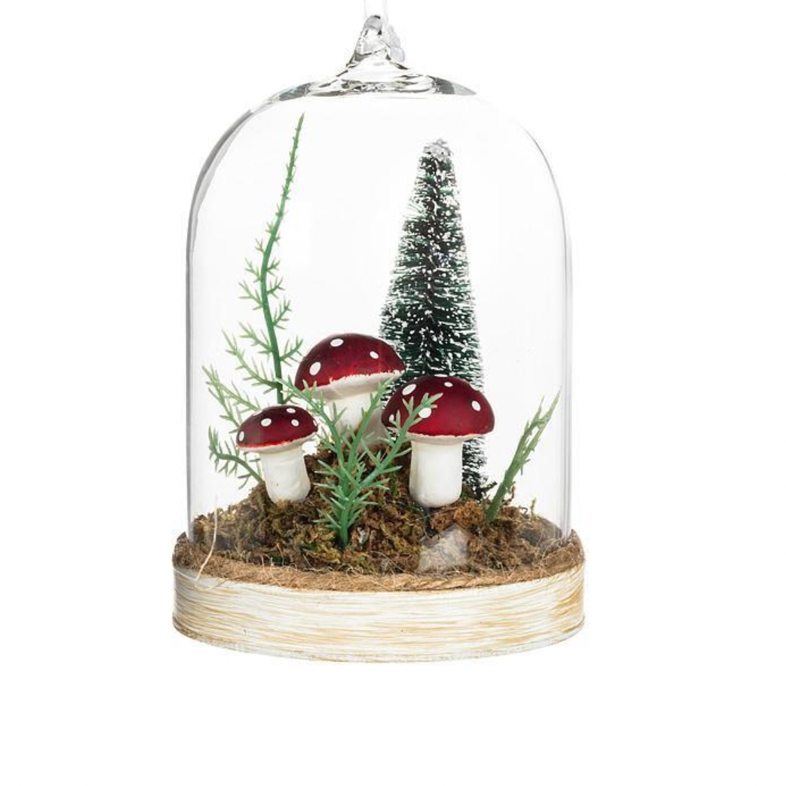 You don't have to be a forest forager to appreciate the fun funghi of this Mushroom in Forest Dome Ornament. Crafted out of glass and plastic, this dome-shaped ornament is filled with a variety of merry mushrooms for unique addition to any Christmas tree.