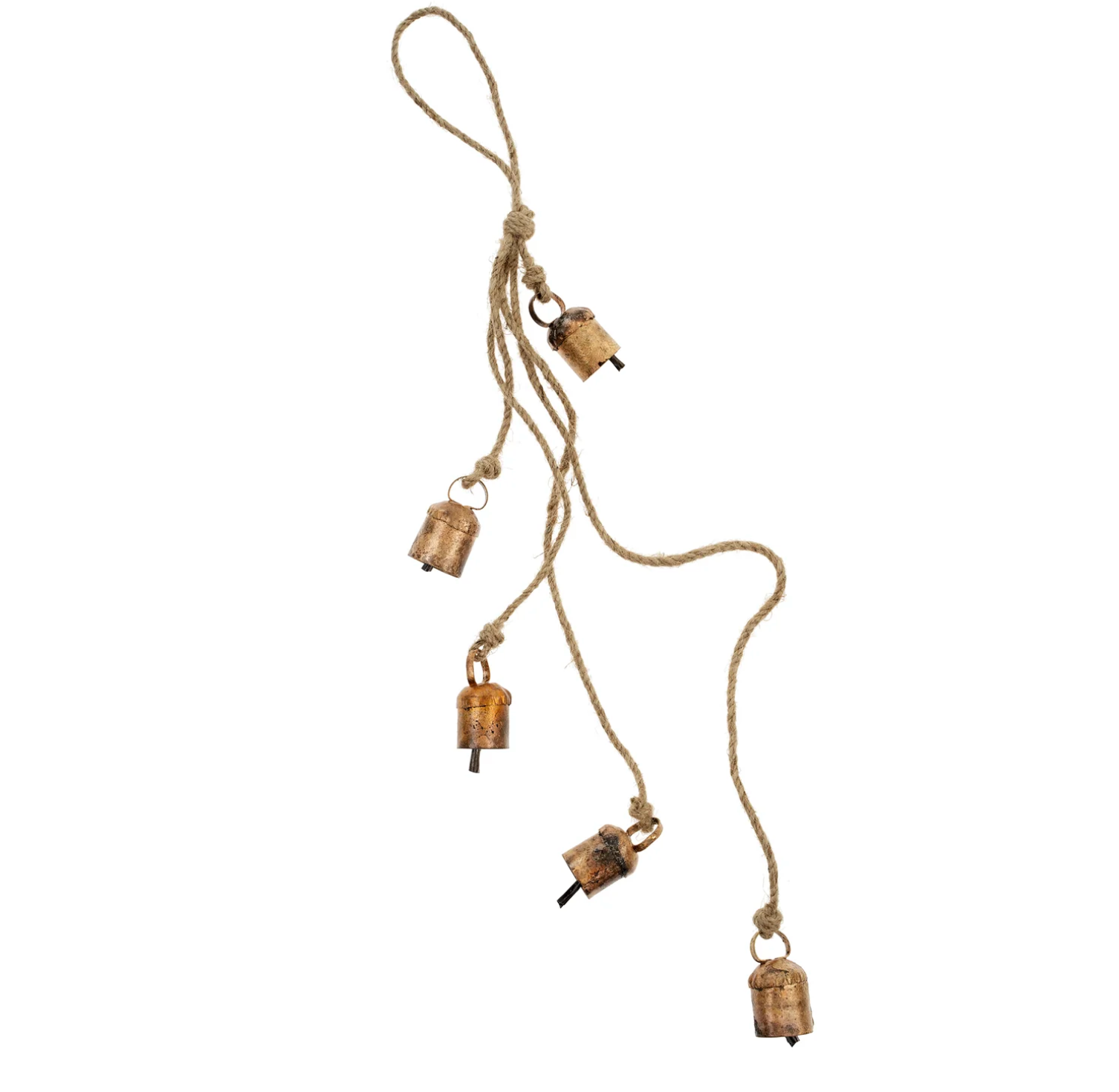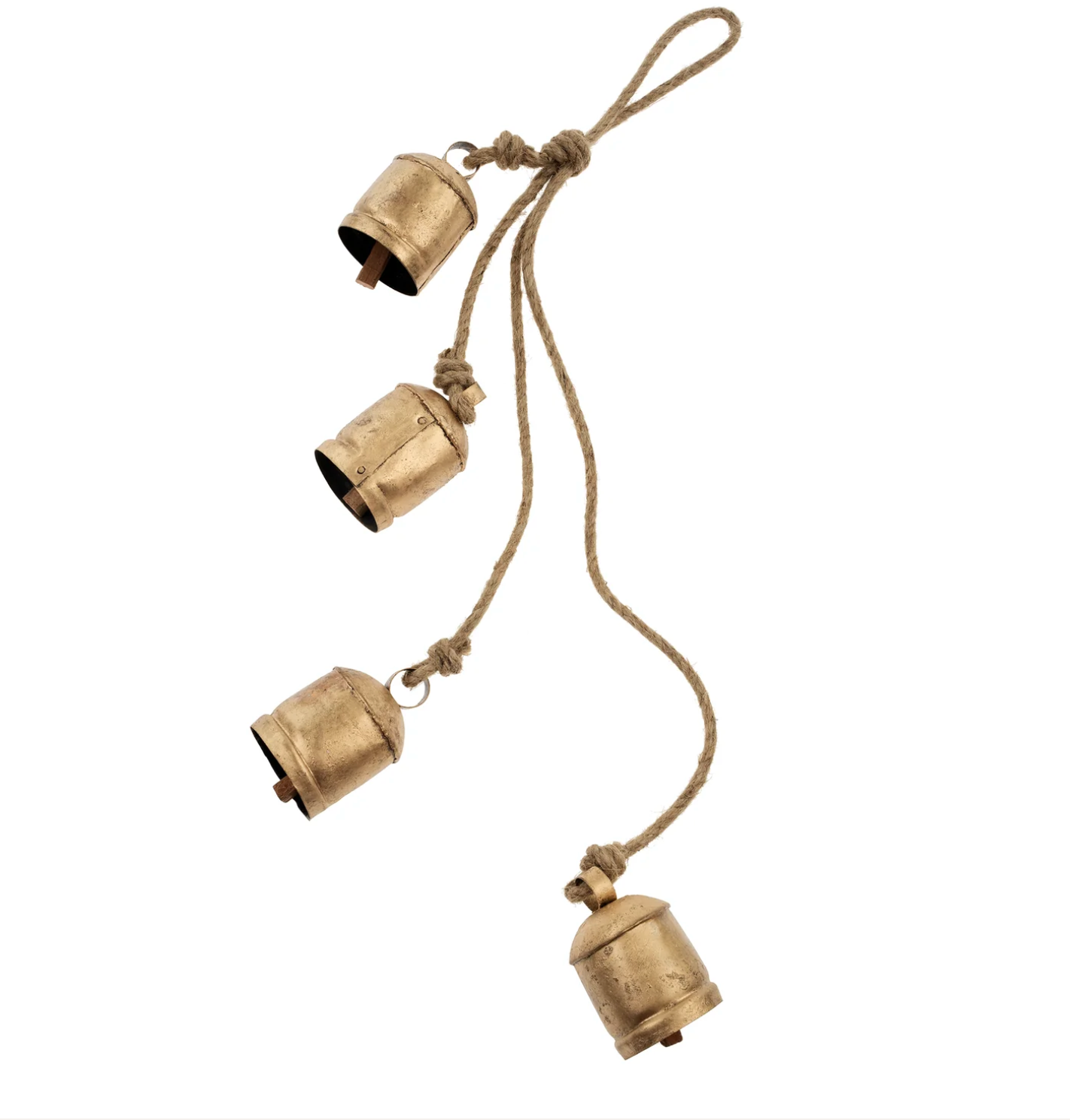 The Rustic Bell Cascades feature handmade, up-cycled iron and copper Indian cowbells with mango wood clappers and tied on natural jute rope. Bell making is a traditional Indian artform passed down for generations, a skill we are proud to support. Hang them from the end of the mantel, integrate them into festive wreaths, or on stair railings.