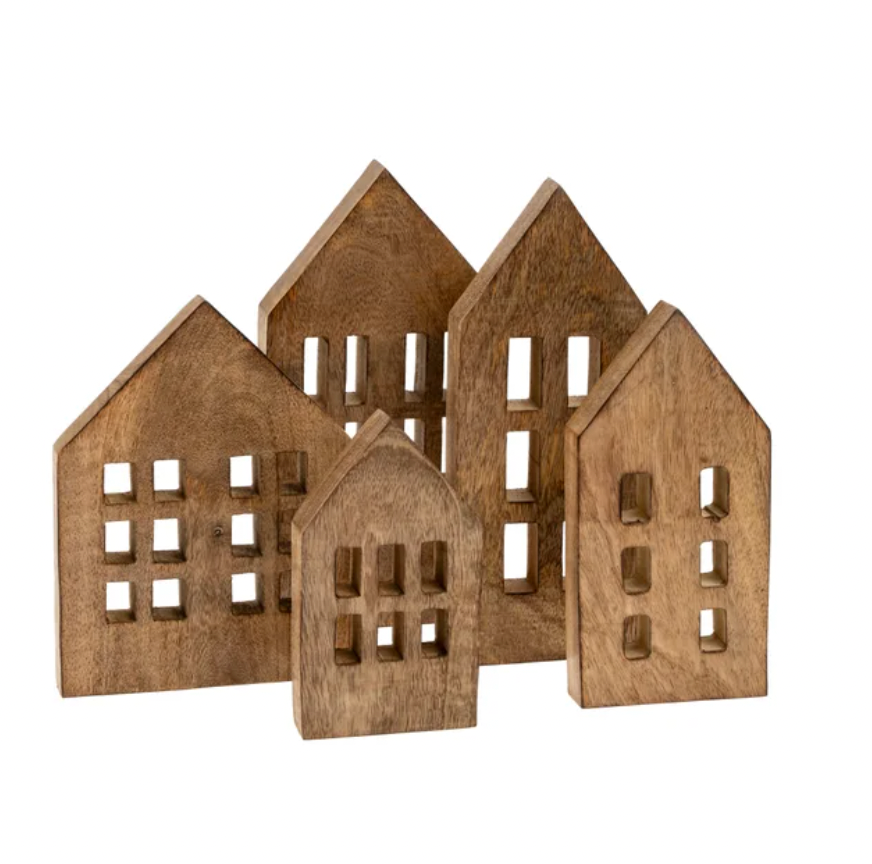 The Wooden Winter House in whitewash or natural are crafted from sustainably sourced mango wood. There are five sizes availabe, all of which offers a simple, classic touch to holiday decor, perfect for displaying on mantels, credenzas, or shelves to create a cozy, festive village scene.