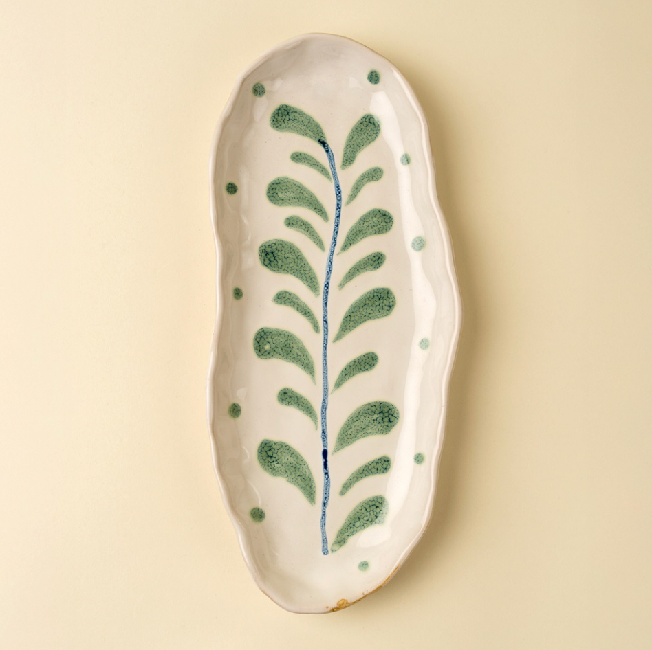 Add a dash of artful flair to your table with the Painted Petals Oval Plate. Crafted from 100% stoneware with an organic hand-formed shape, this charming piece of dinnerware is adorned with hand painted leafy florals that evoke soft watercolor brushstrokes. Finished in a creamy glaze that lets the natural ceramic tones peek through, it feels both relaxed and refined. Perfect for serving olives, appetizers, or sweets.