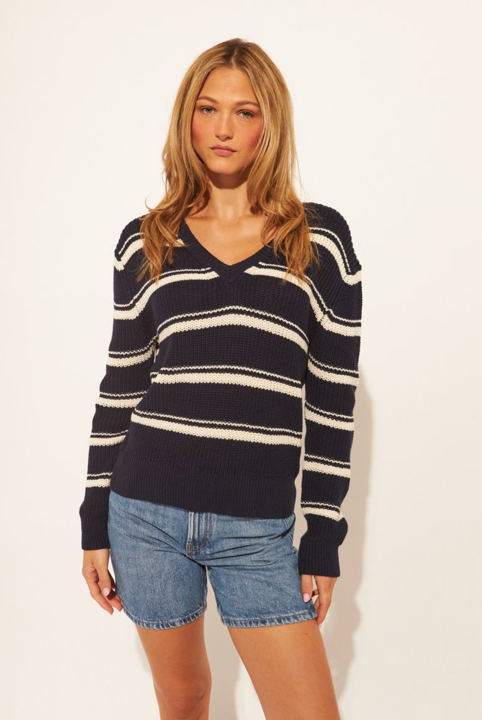 Elevate your everyday style with this classic striped sweater, featuring a comfortable v-neck design and long sleeves in a timeless blue and white palette. Perfect for layering or wearing solo, this versatile piece transitions seamlessly from casual outings to relaxed office settings.