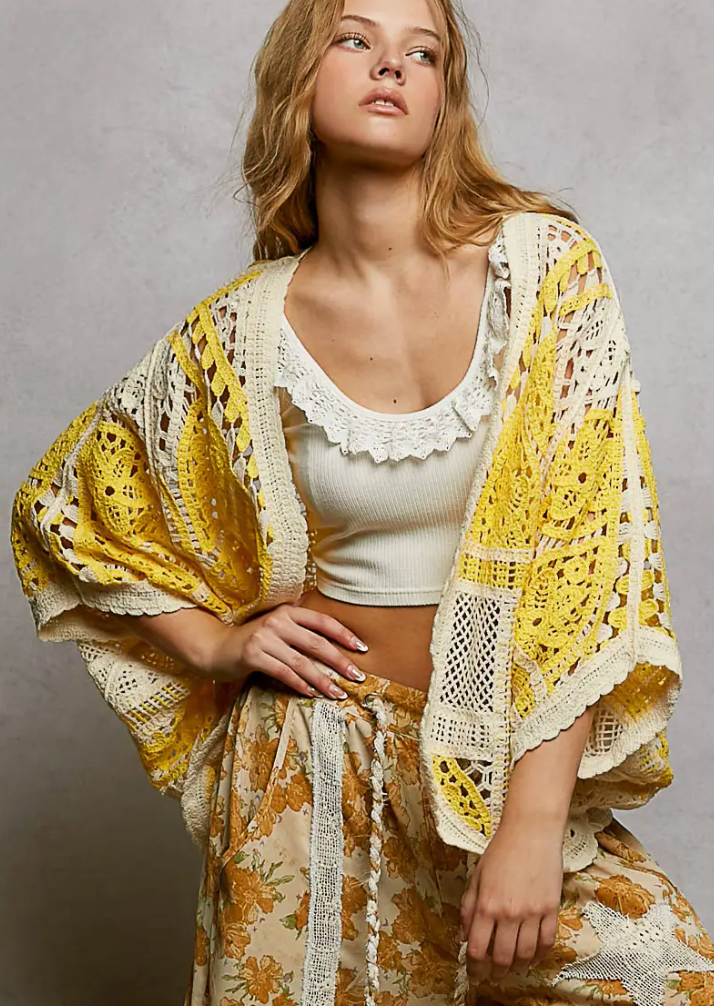Layer effortlessly with this beautifully crafted crochet cardigan, designed for comfort and style. The relaxed fit and flowing 3/4 batwing sleeves create an easy, flattering drape that works with any outfit. Intricate weave patterns throughout showcase artisanal detail, while delicate scalloped edging adds a charming finishing touch. Perfect for those who appreciate handmade quality and timeless, versatile pieces that feel as good as they look.