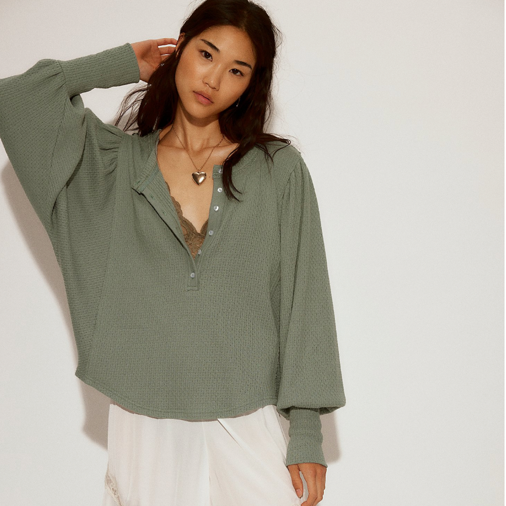 This Jade Ash coloured knit thermal has voluminous sleeves that instantly elevate this knit henley from We The Free, giving it that crafty detail.