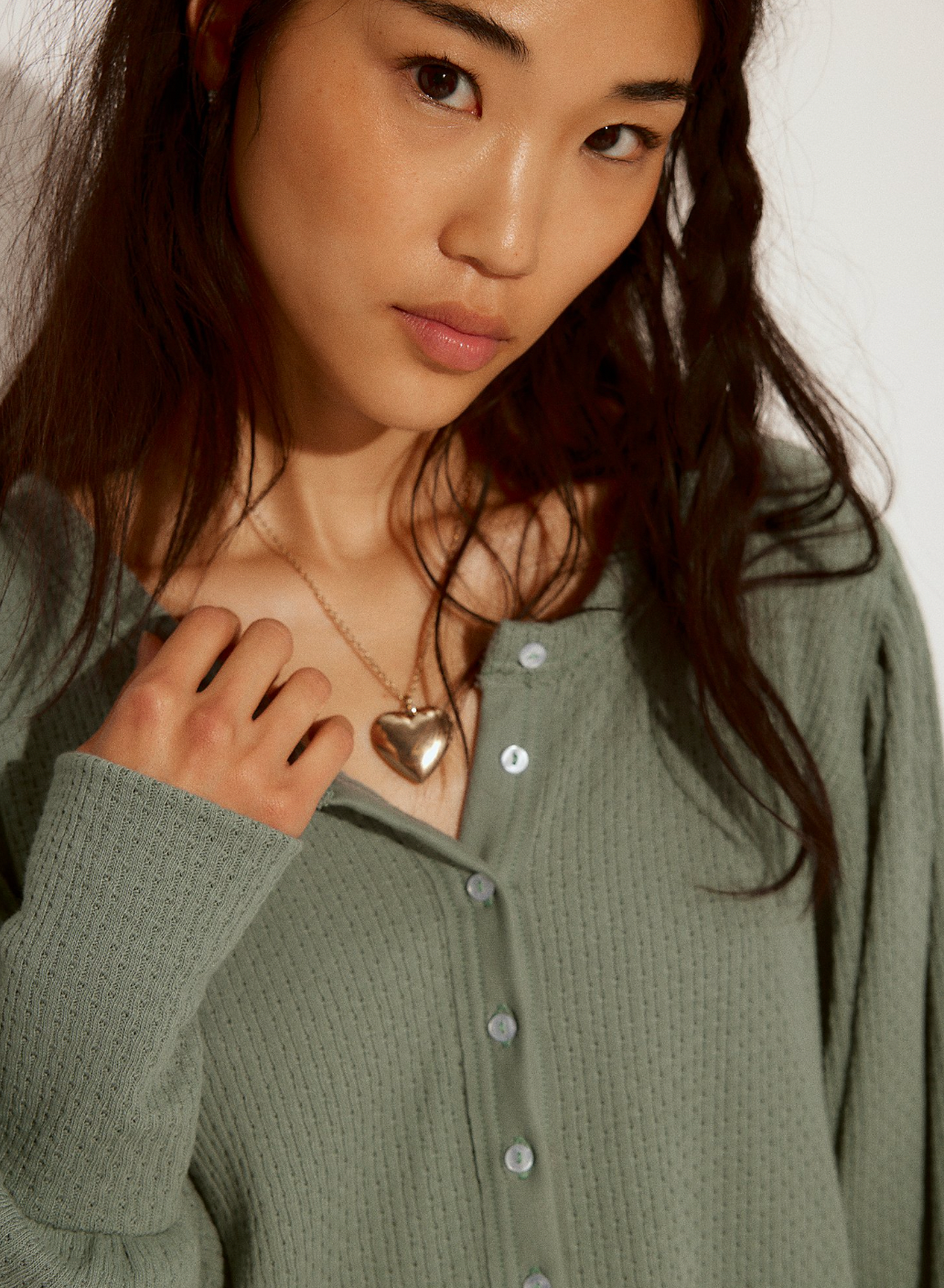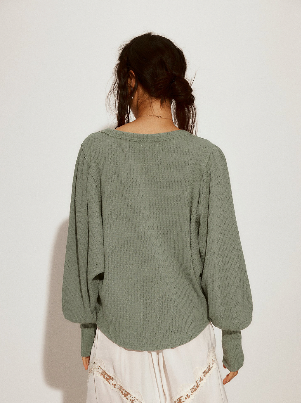 Henley neckline, thermal cotton blend, dolman balloon sleeves, oversized fit, fitted cuffs