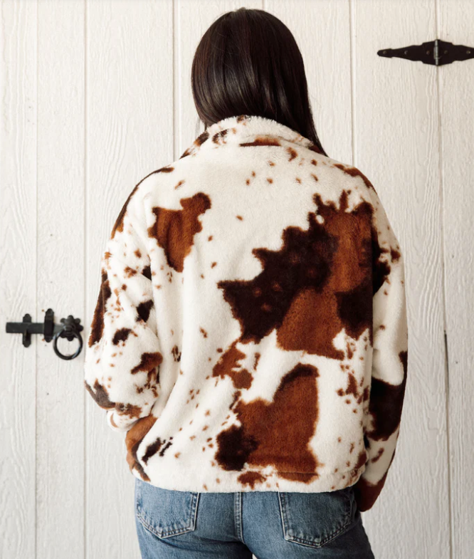 This ½ zip jacket is made in playful cow print faux fur with cotton binding along the silver zipper and a comfy jersey lining. It can be worn zipped up for ultimate warmth or undone for a relaxed, effortless look. The bottom cinch lets you adjust the fit, a little more bubbly, a little more polished, whatever you’re feeling that day.