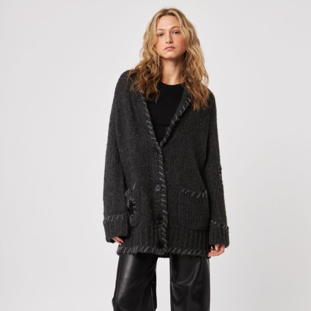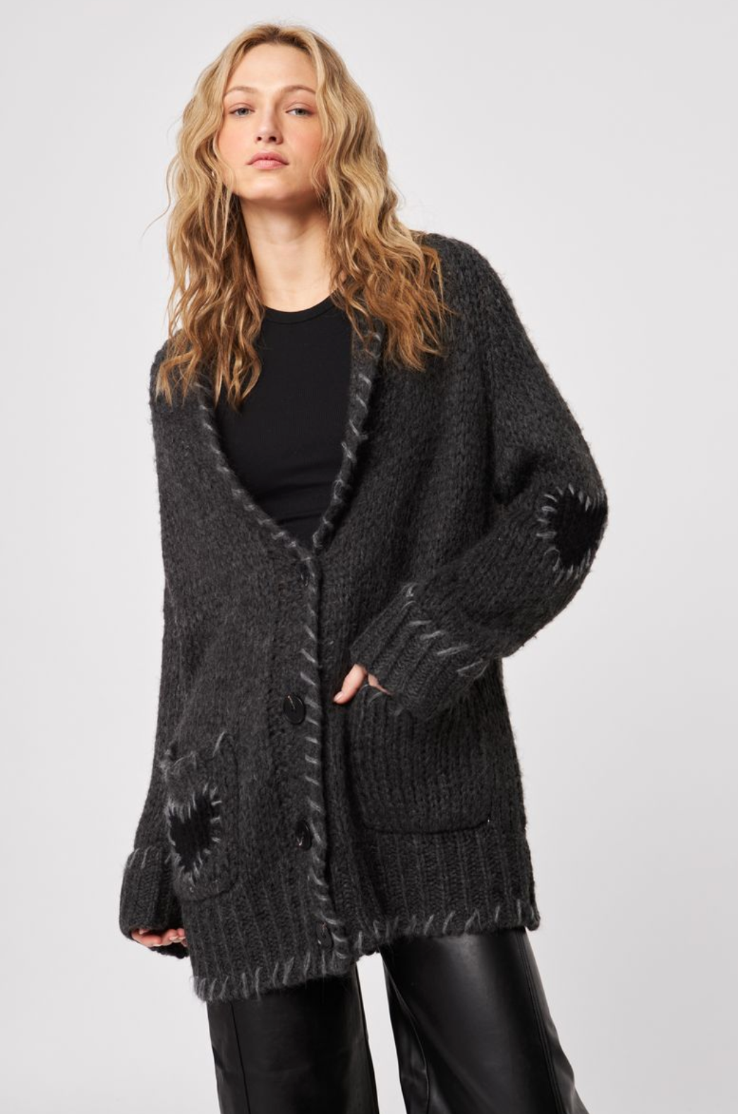 Stay snug in style with this charming cardigan featuring playful open stitching and a subtle monotone hearts that adds a sweet touch.