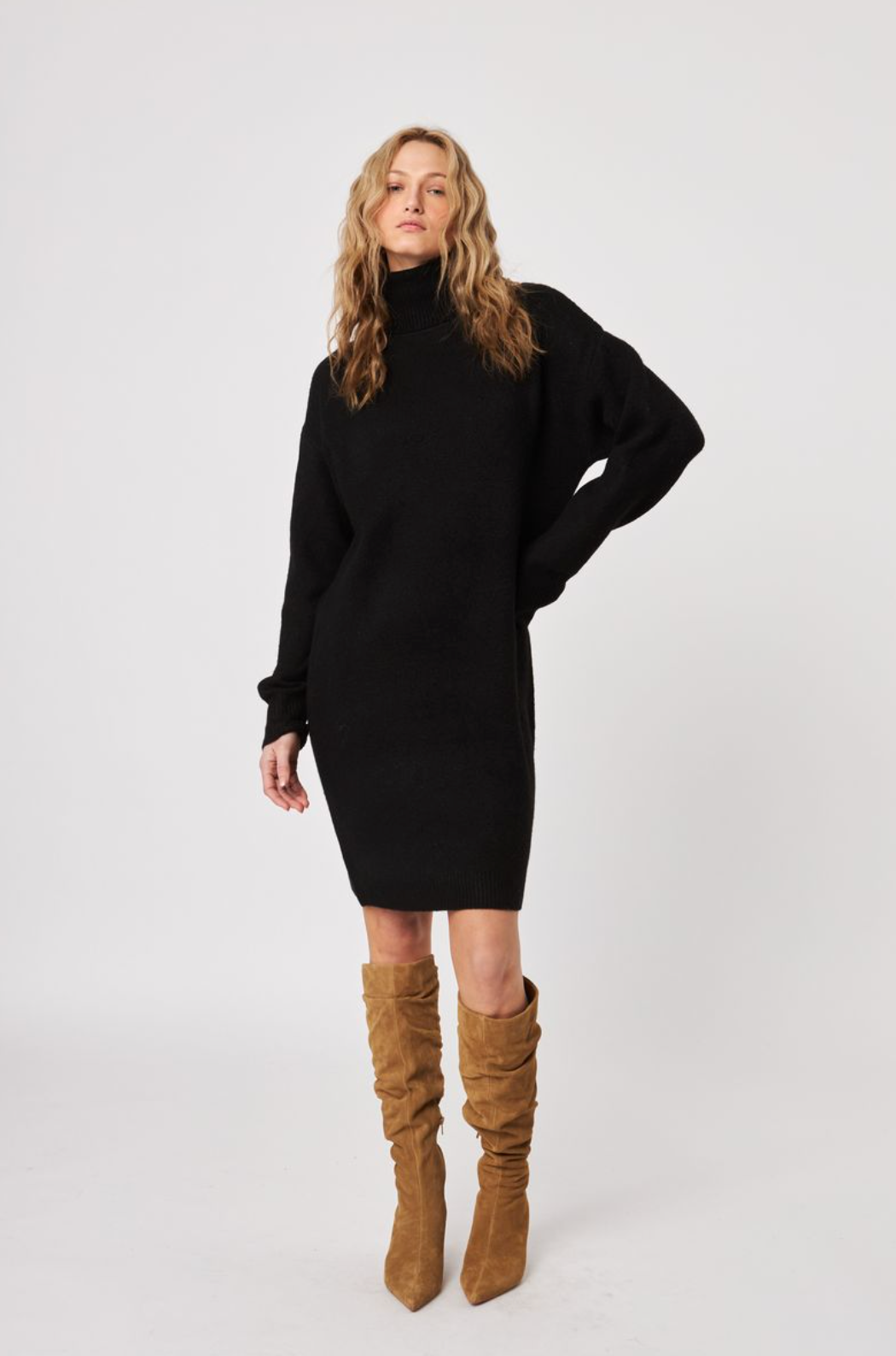 This charming sweater dress dazzles and is just right for cozying up during chilly fall and winter days.