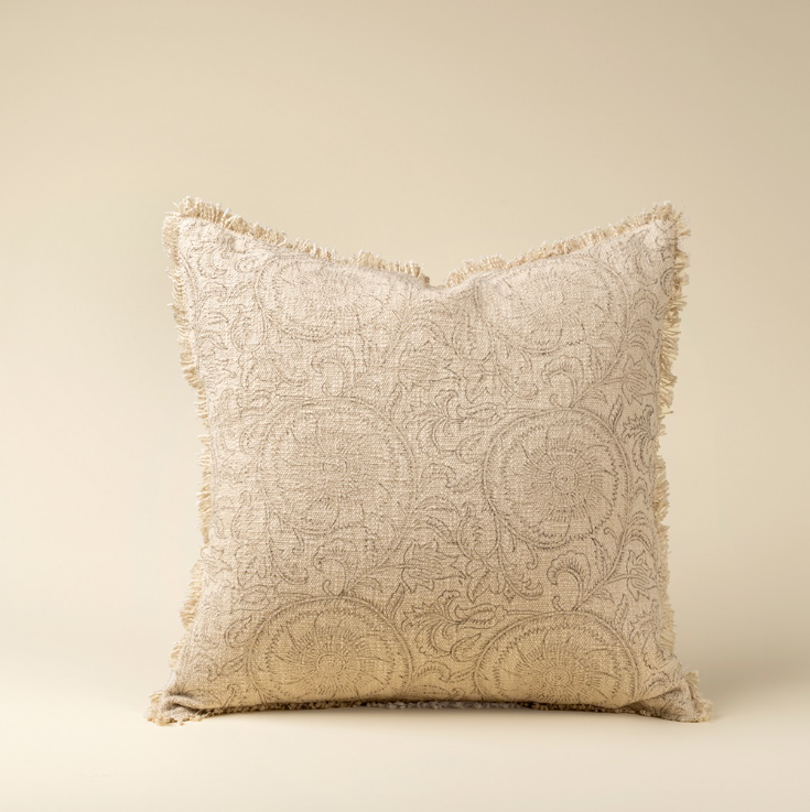 Create a serene and stylish space with the Botanique Fringe Pillow. Woven from 100% cotton with a soft slub texture and leafy embroidered pattern, this couch pillow adds quiet detail and relaxed elegance to your living room or bedroom. Down filled.