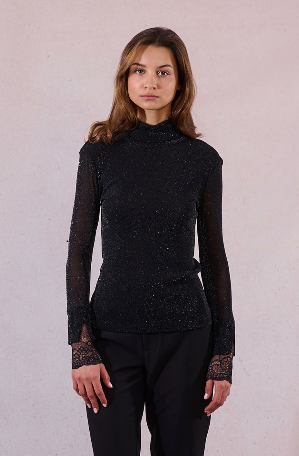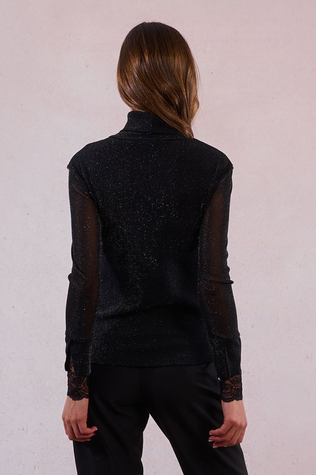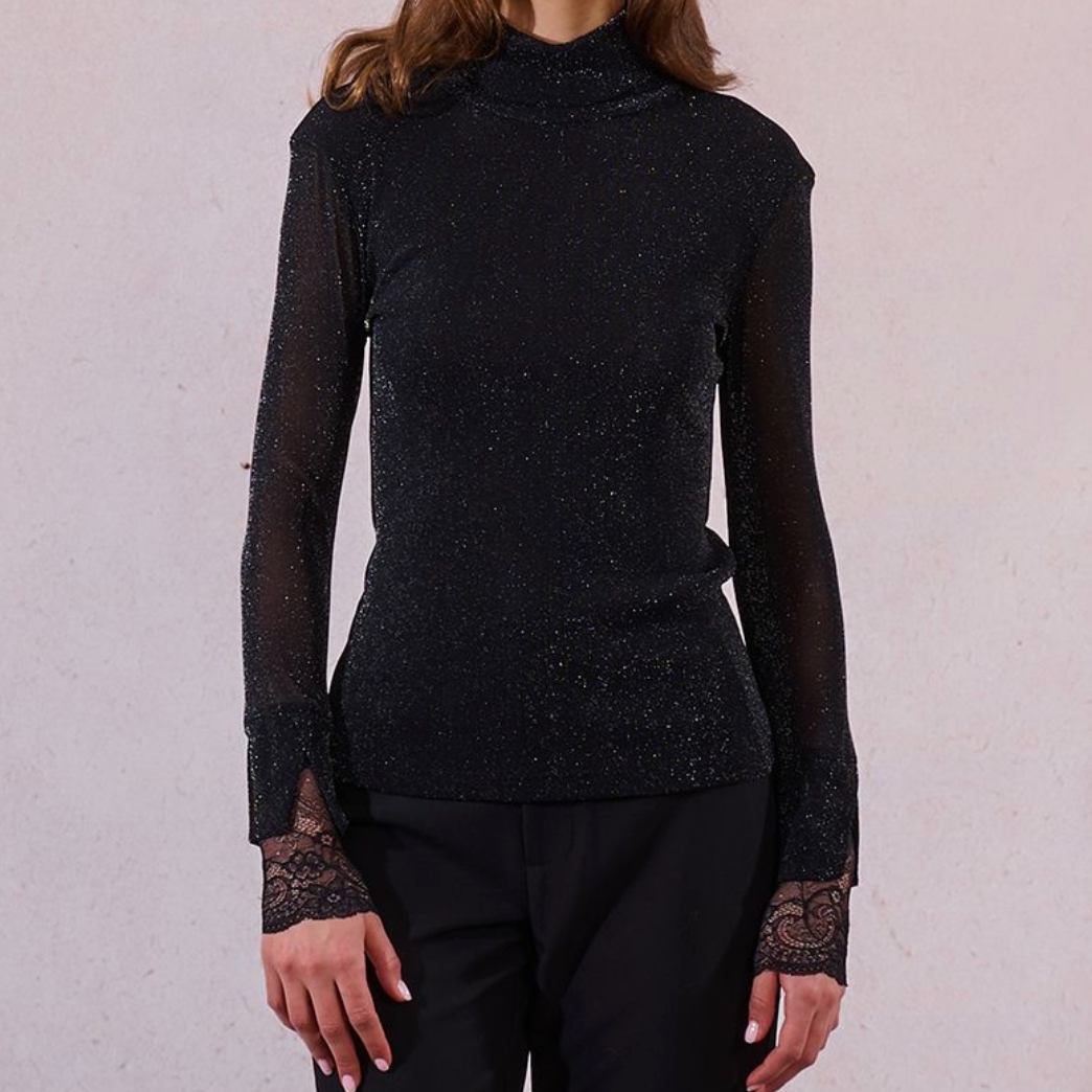 This charming black shimmer shirt adds a flirty touch to any outfit with lace cuffs. Perfect for layering up your style with a bit of fun!