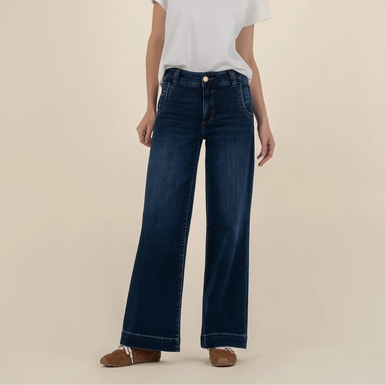 - Make a statement in these high-rise wide leg jeans, featuring oversized wide stitching for a bold, elevated look. Crafted from stretchy material in a rich Euro base wash, they offer both standout style and all-day comfort.
